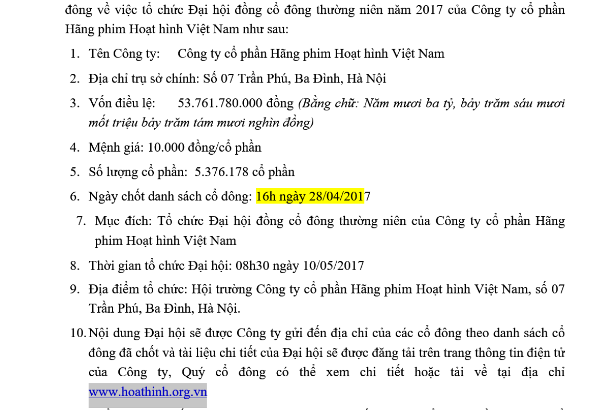 THÔNG BÁO: Về việc chốt danh sách cổ đông để tổ chức Đại hội đồng cổ đông thường niên 2017